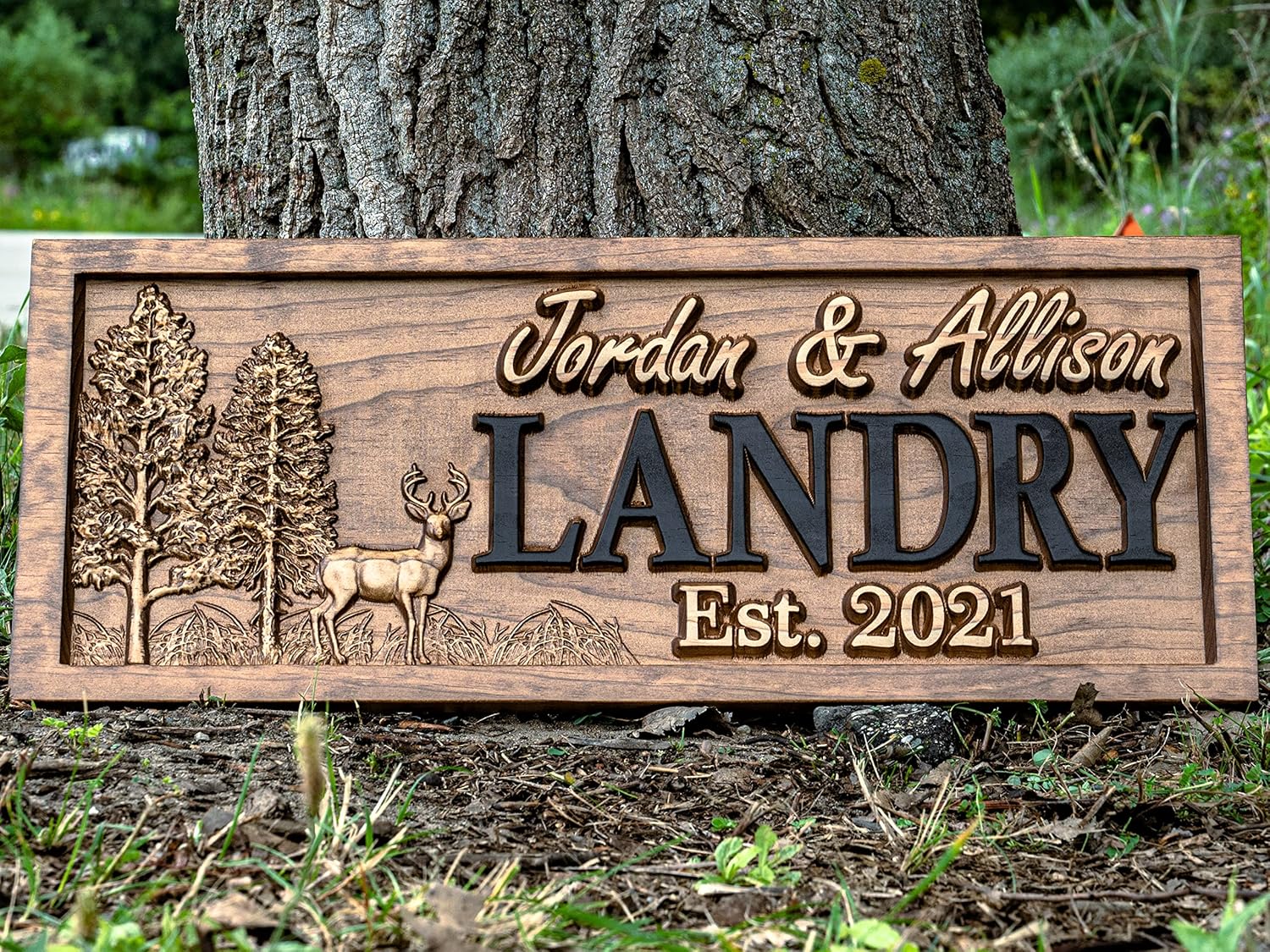 - Personalized Wood Carved Name Sign with 3D Trees and Deer