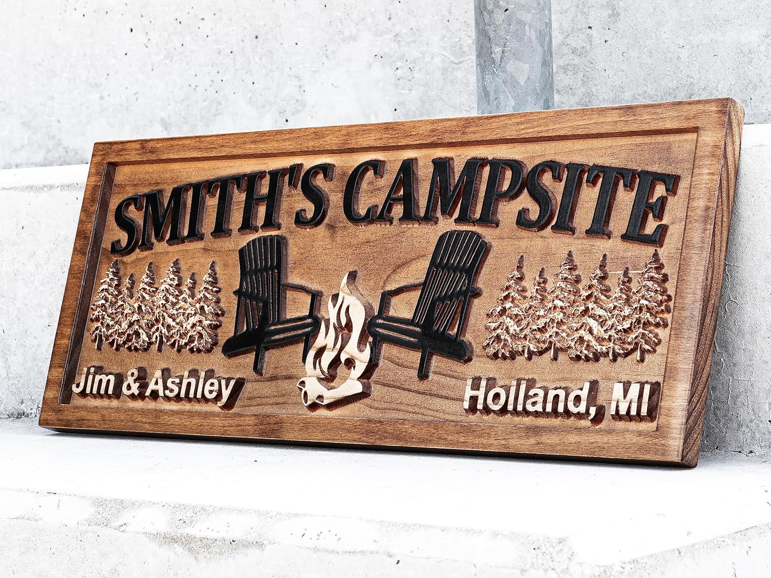 - Personalized Wood Carved Name Sign with 3D Chairs, Campfire, and Trees
