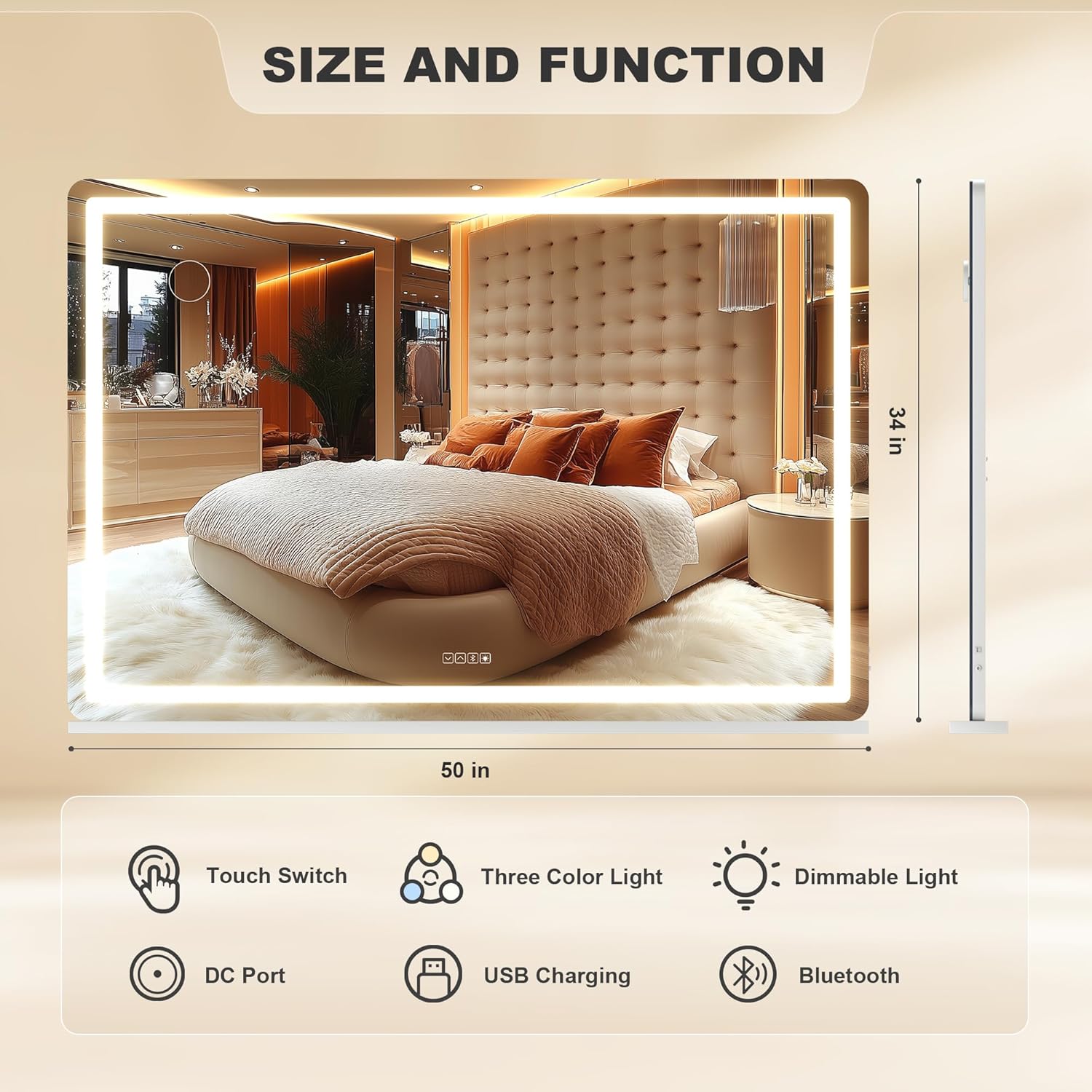 - đăSmart Touch Control & Memory FunctionăThis makeup mirror with lights has 3 smart touch buttons, turn on/off the light by touching the sensor switch, press the left button to change the color modes, and long press the right button to adjust the LED brightness. This lighted makeup mirror is designed for memory function and keeps your lights set like last use.