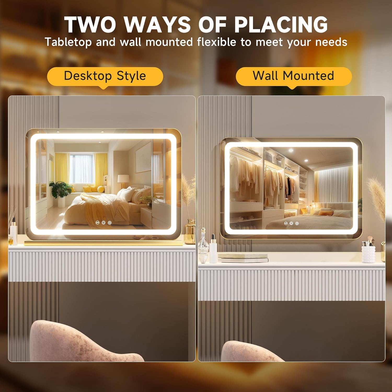 - đăDetachable Mirror Base & Hanging settingăWall mounted or Table Top design meet your different needs.This large makeup mirror designed with detachable base and two back hole for nail. 1.Removing mirror base with a screwdriver. 2.Knocking two nails on the wall. 3.Hanging mirror on the wall.